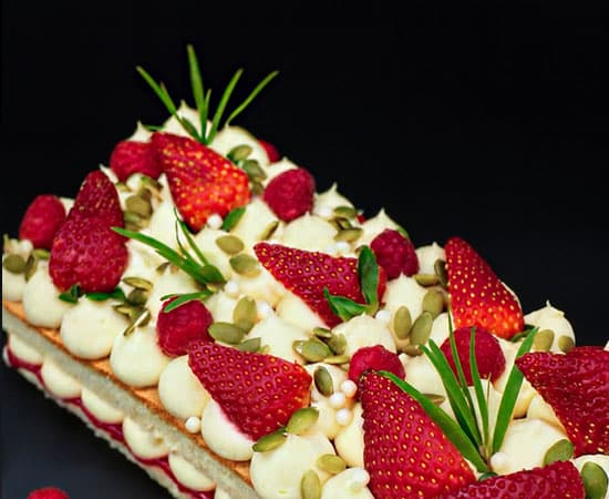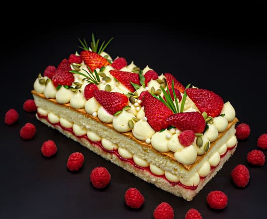 Vanilla sponge cake with jam and cream. Finished with seasonal berries.