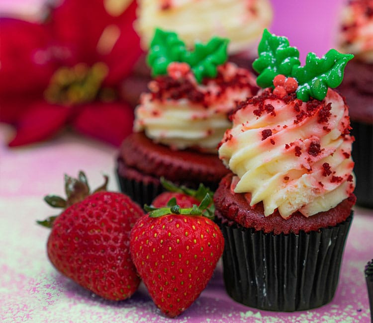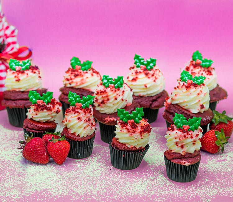 Christmas red velvet cupcakes – traditional red velvet sponge topped with cream cheese icing and Christmas cheer.